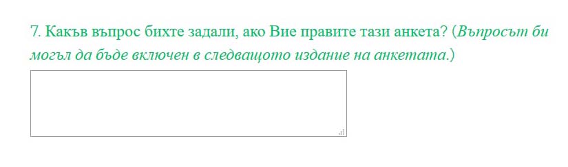 113 респонденти от участниците досега са предложили свои въпроси, които да включим в следващото издание на анкетата. Сред най-интересните от тях са такива, свързани с електронното гласуване, дали искаме децата ни да живеят в България, дали децата на българите зад граница посещават някое българско училище в страната, в която живеят, какво е накарало емигрантите да напуснат Родината, дали имаме вяра, че нещата в България ще се оправят, и др.