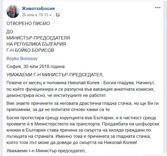 Инициативен комитет „Живот за Босия“ излезе на 30 юли т.г. с Отворено писмо до Бойко Борисов. В писмото се казва: