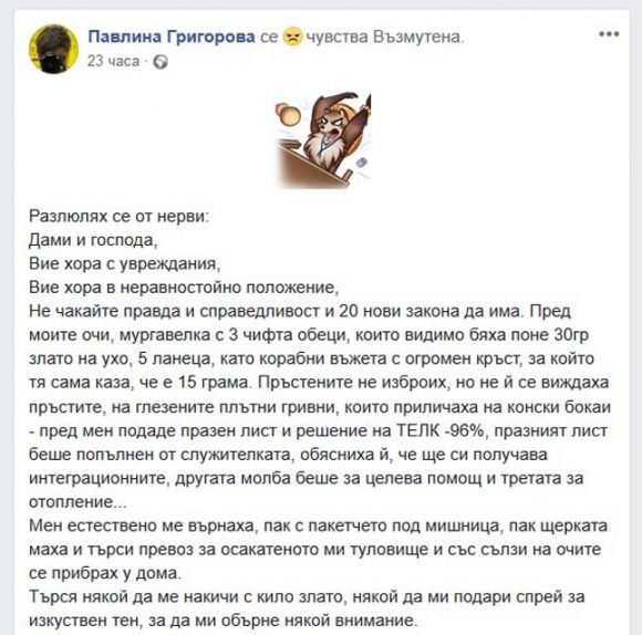 Не чакайте правда и справедливост, и 20 нови закона да има. Пред моите очи, мургавелка с 3 чифта обеци, които видимо бяха поне 30 грама злато на ухо, 5 ланеца като корабни въжета с огромен кръст, за който тя сама каза, че е 15 грама. Пръстените не изброих, но не й се виждаха пръстите, на глезените – плътни гривни, които приличаха на конски букаи – пред мен подаде празен лист и решение на ТЕЛК (96% инвалидност), празният лист беше попълнен от служителката, обясниха й, че ще си получава интеграционните, другата молба беше за целева помощ и третата за отопление…