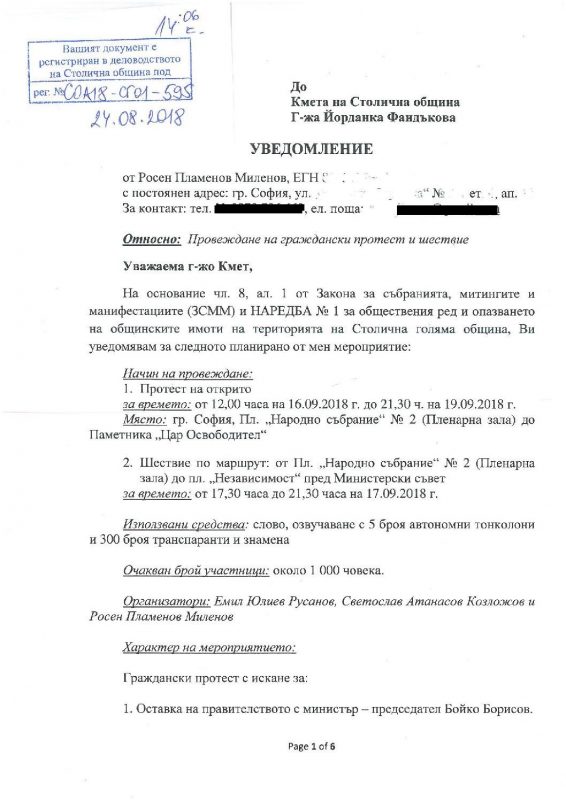 На основание чл. 8, ал. 1 от Закона за събранията, митингите и манифестациите (ЗСММ) и НАРЕДБА № 1 за обществения ред и опазването на общинските имоти на територията на Столична голяма община, Ви уведомявам за следното планирано от мен мероприятие: