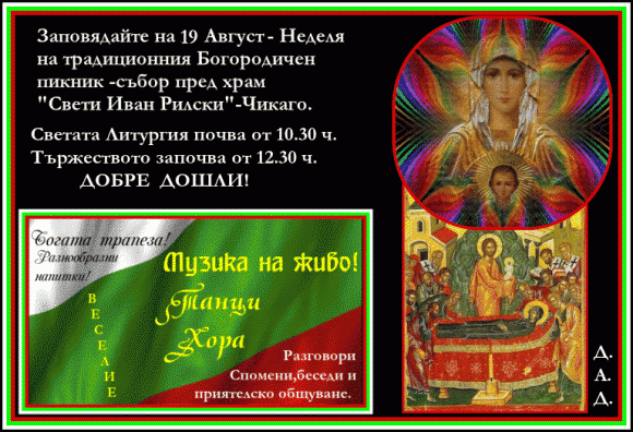 На 19 август, неделя, от 10.30 часа, ще започне Светата литургия в храма „Св. Иван Рилски Чудотворец“ в Чикаго. След това, от 12.30 часа, ще започне традиционният Богородичен пикник-събор. Съборът ще се състои скоро след големия църковен празник Успение Богородично, който се чества всяка година на 15 август.