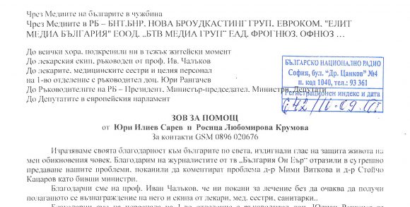 В редакцията на Еврочикаго се получи зов за помощ от Юри Сарев, онкоболен, който не може да постъпи за лечение с лъчетерапия в УМБАЛ „Царица Йоанна – ИСУЛ“ в София, поради липса на лична карта, и от неговата приятелка, с която живее и която се грижи за него, Росица Крумова. Апелът е адресиран до БНР, БНР, Нова ТВ, bTV, ТВ „Евроком“, Фрогнюз, Офнюз, други медии в страната, до българските медии зад граница, както и до лекари от ИСУЛ, депутати, министри, президента на републиката, евродепутати. Апелът е бил занесен вече на хартиен носител в някои медии в София и е бил заведен в БНР. В него Юри и Росица изразяват и благодарност на лекари от ИСУЛ, на ТВ „България от еър“, която направи репортаж за случая, както и на българи в чужбина, които се опитаха да им помогнат.