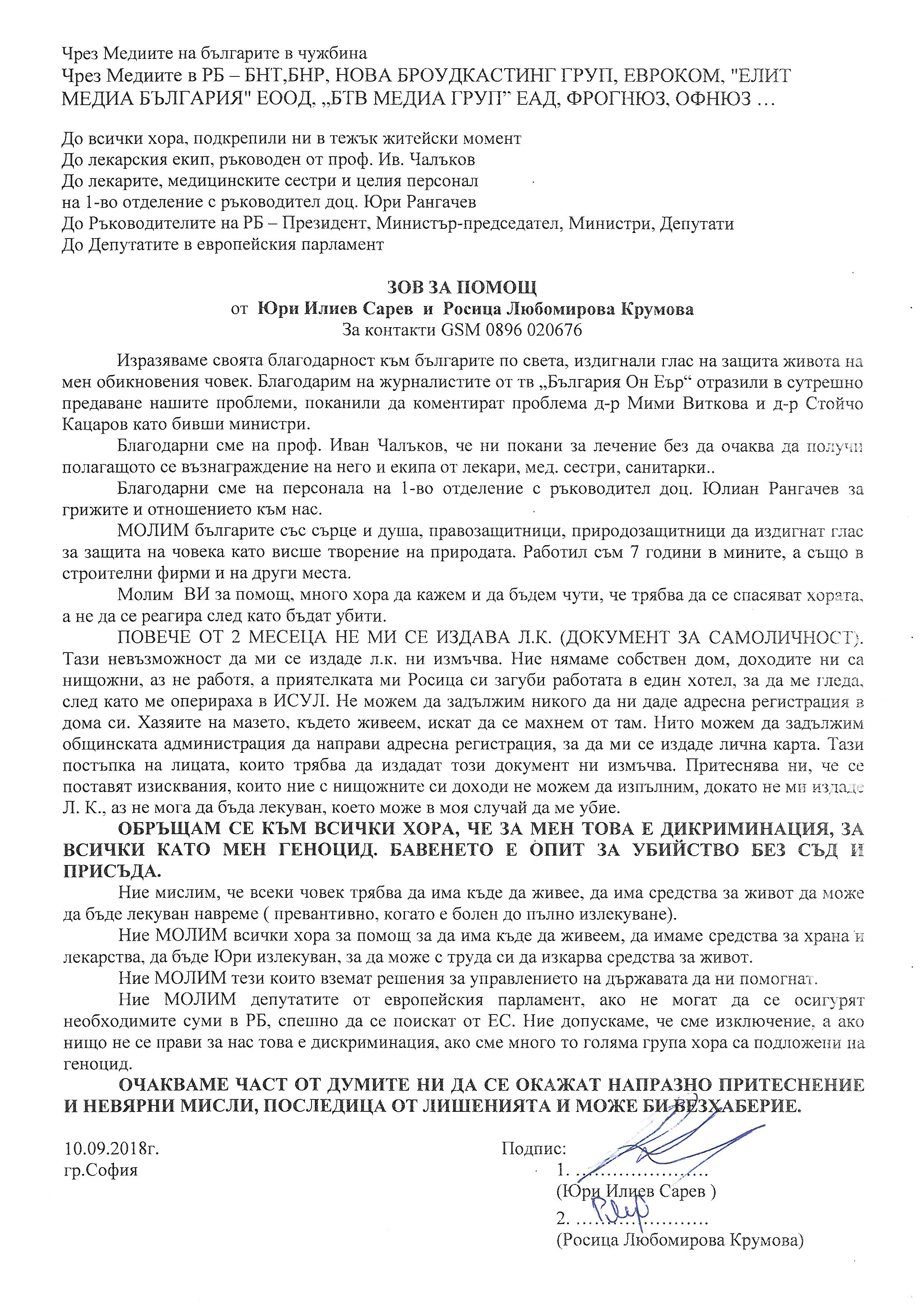 В апела се казва, че повече от два месеца на Юри Сарев не е бил издаден документ за самоличност, защото той няма адресна регистрация, адресът, който е имал в родния си Златоград, е невалиден, те двамата с неговата приятелка Росица нямат собствен дом, живеят в едно мазе, собствениците на което не желаят да им дадат адресна регистрация и искат те да го напуснат. Юри и Росица са отчаяни. За да се реши проблемът с липсата на ЛК на Юри, трябва, при настоящите регламенти в България, в които наистина не е помислено за това как хора без собствен дом и даже без реален адрес могат да постъпят за процедури като лъчетерапия или химиотерапия, защото Здравната каса изисква задължително от болниците в такива случаи номер на лична карта на пацента, трябва много по-активно съдействие и координация между различни институции. Трябва и добра воля от някого, който да им даде, макар и съвсем формална адресна регистрация, както и съдействие от съответната община, която да направи такава адресна регистрация. Юри Сарев вече бе оставен два месеца на произвола на съдбата, преди да бъде приет в ИСУЛ на 8 август т.г., с посредничеството на социални служители, и веднага, на следващия ден, опериран. Но не може да влезе за последващо лечение с лъчетерапия, защото няма документ за самоличност.