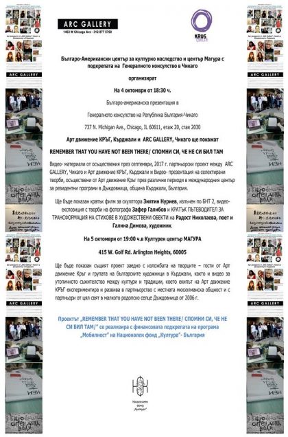 Видео материали от осъществения през септември 2017 г. партньорски проект между ARC GALLERY – Чикаго и Арт движение КРЪГ – Кърджали.