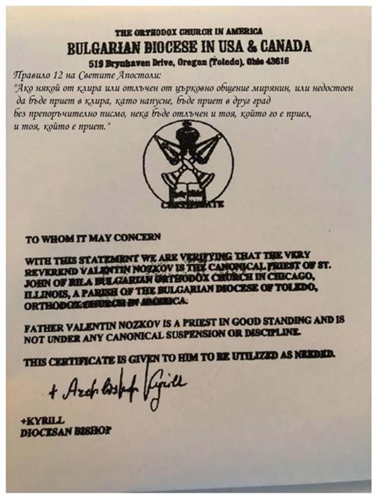 2/ Като свещеник тук е бил представен с лъжа, че е с изрядни документи /good sranding/, лицето Валентин Борисов Ноцков, който е дошъл за втори път в Америка без отпустително писмо и по-късно низвергнат за неподчинение. Според каноните, той е лъжесвещеник и всички тайнства, извършени от него, са невалидни и престъпни, като никога не са издавани документи за тях.