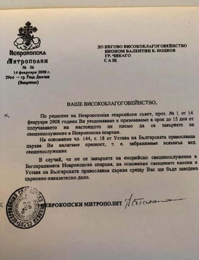 Да започнем с кратка история. Ноцков е пратен от ДС службите, като “подходящ наш човек, който се бори с вражеската емиграция”, през 1983 г. След 10-годишен престой и “подвизи” в Чикаго, той си тръгва обратно за България, като от касата на църквата липсват, потънали в джоба му, $ 88 000. Като свещеник в Благоевград той е низвергнат от митрополит Пимен през 1993 г., поради сериозни нарушения, без право да служи. Документът тук: