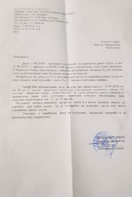 Полицията в Босилеград не разреши провеждането на публично събрание в центъра на Босилеград, организирано от Стефан Костов, частен бизнесмен и водач на листата „Да върнем достойнството на народа“ на изборите за Национален съвет на българското малцинство в Сърбия, които ще се проведат на 4 ноември.