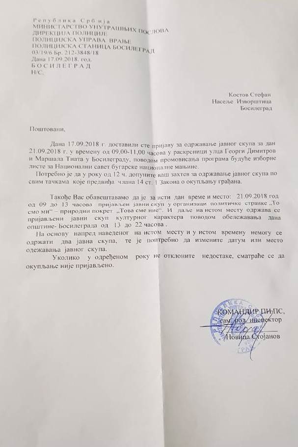 В писмото, подписано от командира на полицията в Босилеград Новица Стоянов, пише, че партията „Това сме ние“ също е подала заявление за провеждане на две публични събрания на същото място в центъра на Босилеград, от 9 до 13 и от 13 до 22 часа!? Става дума за партията на кмета и актуалния председател на Националния съвет на българското малцинство Владимир Захариев.