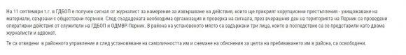 „На 11 септември т.г. в ГДБОП е получен сигнал от журналист за намерение за извършване на действия, които ще прикрият корупционни престъпления – унищожаване на материали, свързани с обществени поръчки. След създадената необходима организация и проверка на сигнала, през вчерашния ден на територията на Перник са проведени оперативни действия от служители на ГДБОП и ОДМВР-Перник. В района на установеното място са задържани три лица, които в последствие са се представили като двама журналисти и адвокат.