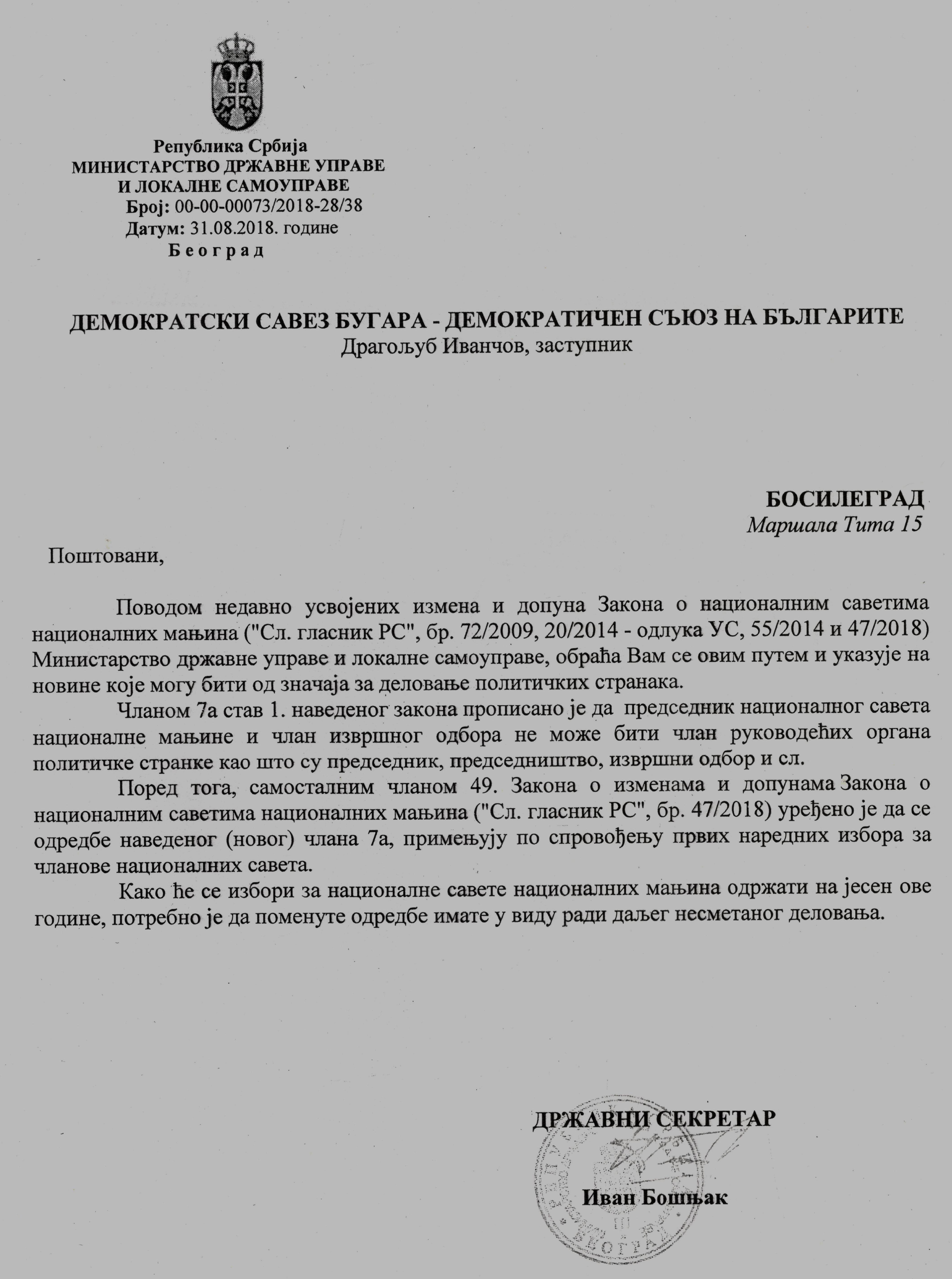 Демократичният съюз на българите още в началото на септември служебно бе осведомен с писмо, подписано от държавния секретар на Министерството за държавно управление и местно самоуправление Иван Бошняк, за „промените“ в Закона за националните съвети на националните малцинства, според които председател на Национален съвет на малцинствата не може да бъде член на управляващите органи на партията, каквито са председател, председателство, изпълнителен орган и пр. Логическият извод беше, че щом лидерите на малцинствените партии не могат да бъдат председатели на Националния съвет, няма смисъл и да се кандидатират на изборите.