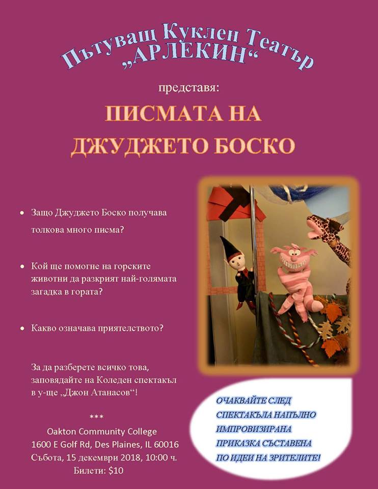 На 15 декември 2018 г. в Българското училище „Джон Атанасов“ в Чикаго ще бъде представен първият ни спектакъл като пътуващ куклен театър „АРЛЕКИН“. Приказката „ПИСМАТА НА ДЖУДЖЕТО БОСКО“ ще бъде последвана от специална игра с публиката, в която по идеи на децата ще съставим напълно импровизирана втора приказка.