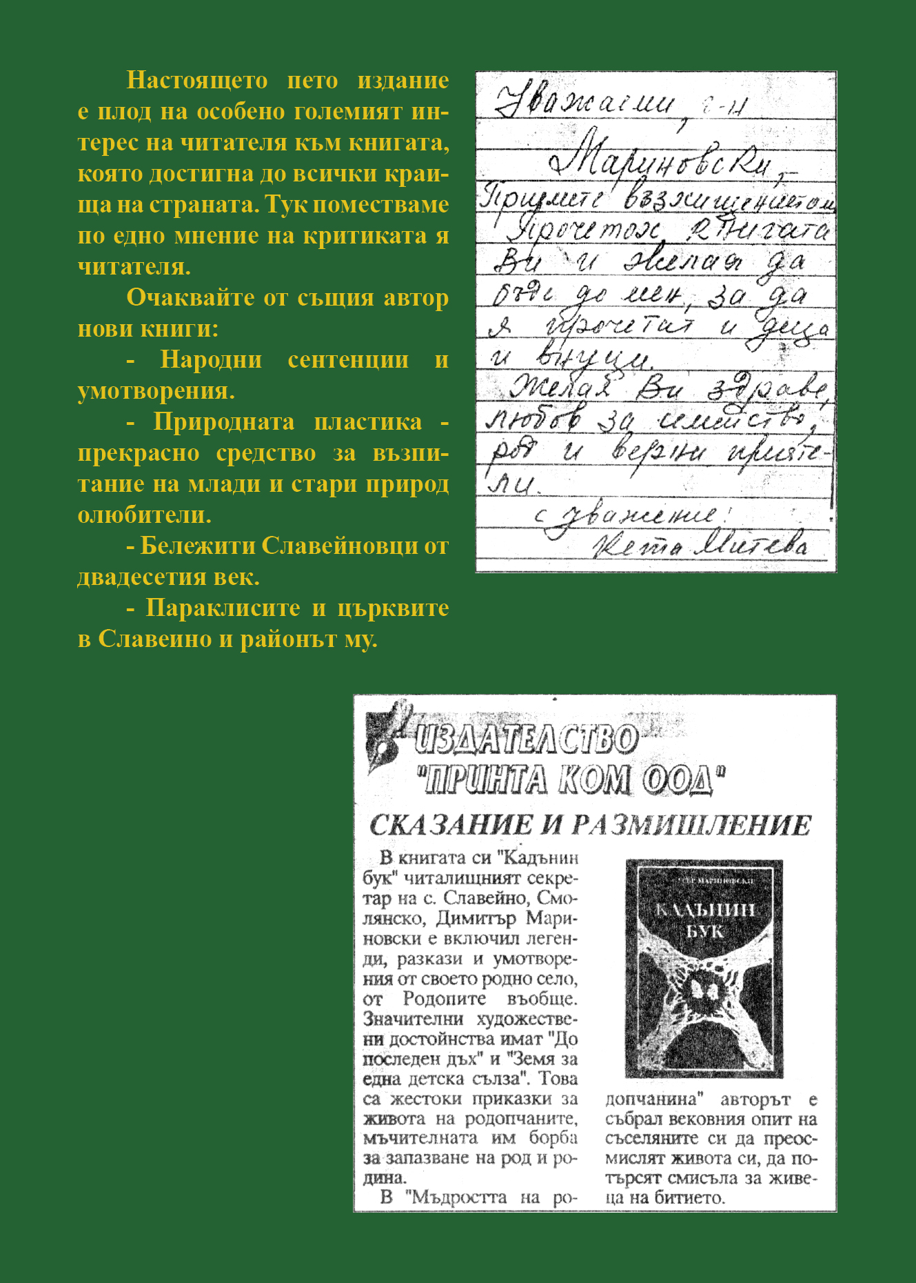 С разрешение на автора Димитър Мариновски и издателството „Принта-КОМ” ООД в Смолян, както и с любезното съдействие на Държавен архив – Смолян и Регионален исторически музей „Стою Шишков” в Смолян, Народно читалище „Съгласие – 1883” в село Славейно и „Сдружение за развитие на с. Славейно”, които ми предоставиха включените снимки от своите фондове, предлагам на читателите разказа „Опълченецът” (б.р.: разказът е поместен отделно – вж. тук), едно вълнуващо повествование от доброволеца в Балканската война Марин Михайлов Мариновски (2.02.1889 – 31.01.1989). Марин Мариновски е брат на дядото на автора на книгата „Кадънин бук” Димитър Мариновски. Този разказ е не само един исторически спомен, а вълнуваща духовна изповед на родопския столетник – Опълченецът Марин Михайлов Мариновски, воювал заедно с четиримата си братя Стоян, Тодор, Христо и Гавраил, срещу османските поробители за Свободата на Отечеството, за да я има България днес и в бъдеще на геополитическата карта на света. Поразява ни и паметта на този 100-годишен български герой, който с удивителни подробности рисува бойните походи до 1918 година и бранните полета, точно характеризира бойните си другари и своите командири, възхищава се от пълководческия талант, честта и достойнството на българските генерали в Балканската война.