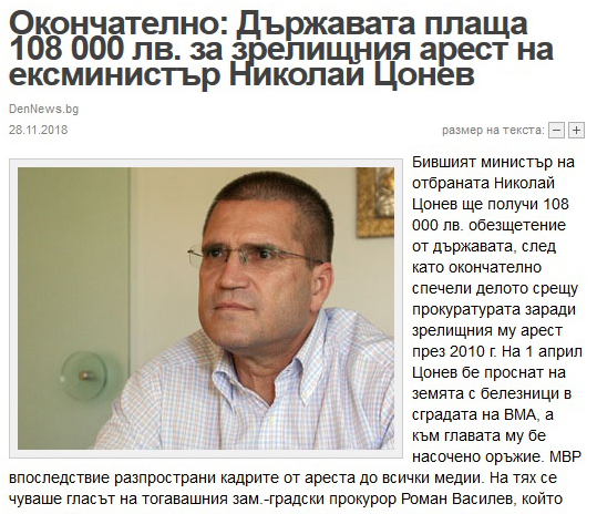 „Бившият министър на отбраната Николай Цонев ще получи 108 000 лв. обезщетение от държавата, след като окончателно спечели делото срещу прокуратурата, заради зрелищния му арест през 2010 г. На 1 април Цонев бе проснат на земята с белезници в сградата на ВМА, а към главата му бе насочено оръжие. МВР впоследствие разпространи кадрите от ареста до всички медии. На тях се чуваше гласът на тогавашния зам.-градски прокурор Роман Василев, който нарече Цонев „абсолютен престъпник” и му нареди да ляга на земята. Делото срещу Цонев приключи окончателно през 2015-а година с оправдателни присъди и на тримата подсъдими. Другите двама обвиняеми – Петър Сантиров и Тенчо Попов, до момента също осъдиха държавата за над 200 000 лева.“ – из информация на Dennews.bg.