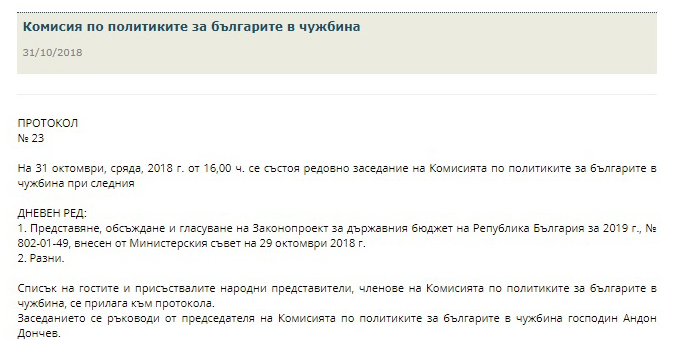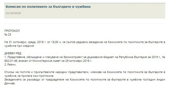 На 31 октомври се състоя заседание на Комисията по политиките за българите в чужбина към Народното събрание, при следния дневен ред: „1. Представяне, обсъждане и гласуване на Законопроект за държавния бюджет на Република България за 2019 г., № 802-01-49, внесен от Министерския съвет на 29 октомври 2018 г.; 2. Разни.“ На заседанието присътваха представители на Министерство на външните работи, Министерство на образоването, Министерство на културата, Министерство на финансите.