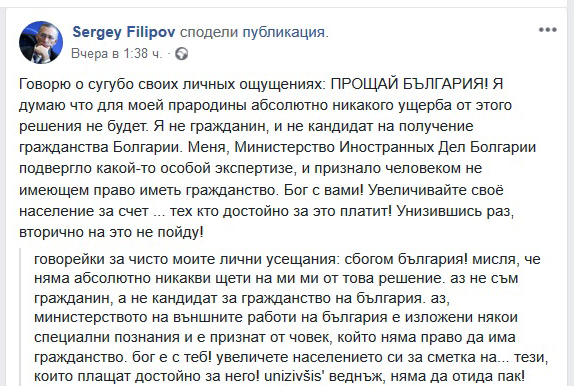 „Говорейки за чисто моите лични усещания. Сбогом, България! Мисля, че за моята прародина няма абсолютно никакви щети от това решение. Не съм гражданин и съм кандидат за получаване на гражданство от България. Министерството на външните работи на България ме подложи на някаква особена експертиза и ме призна за човек, който няма право да има гражданство. Бог да е с вас! Увеличавайте населението си за сметка… на тези, които плащат достойно за това. Унизен веднъж, няма да направя това отново!“ – се казва в съобщението на Филипов.