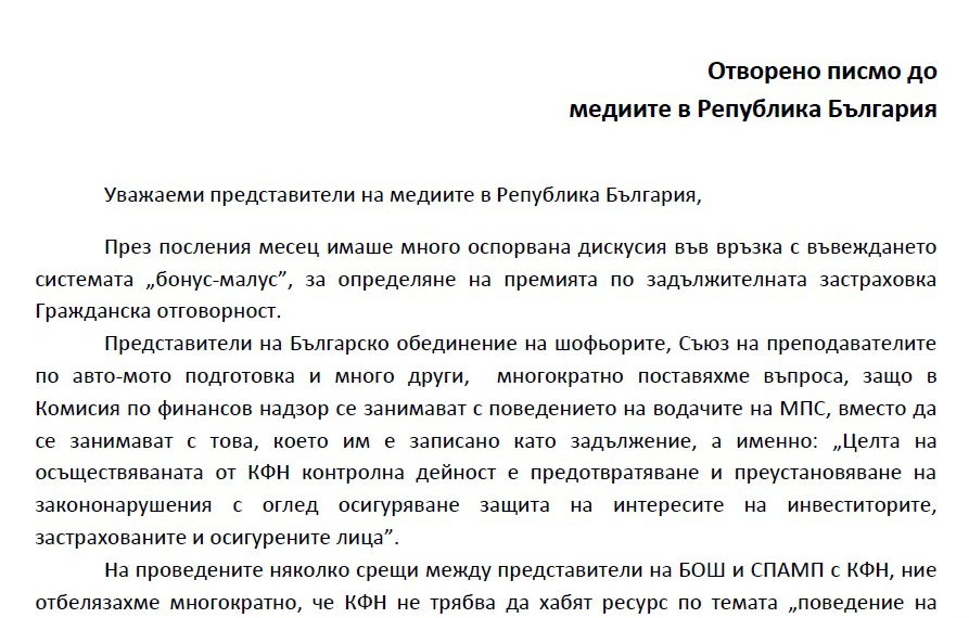 „Искаме да Ви обърнем внимание на факта, че собствениците на МПС в България не са „брашнен чувал” и не трябва да заплащат допълнително за всички грешки и недомислия, които са допуснали работещите в КФН.