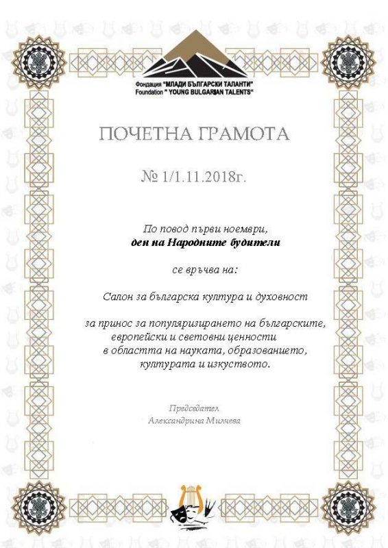 Салон за българска култура и духовност в Чикаго е отличен с поредно признание. Фондация „Млади български таланти“ е наградила Салона с Почетна грамота, за „принос за популяризирането на българските, европейски и световни ценности в областта на науката, образованието, културата и изкуството“.