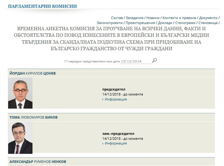 Към българското Народно събрание е създадена 17-членна парламентарна комисия с дългото заглавие „Временна анкетна комисия за проучване на всички данни, факти и обстоятелства по повод изнесените в европейски и български медии твърдения за скандалната подкупна схема при придобиване на българско гражданство от чужди граждани“. Прави впечатление, че в заглавието на комисията се акцентира на твърдения в медиите, не на разследванията на ДАНС и други специализирани органи по отношение на придобиването на удостоверения на БГ произход и даването на БГ гражданство.