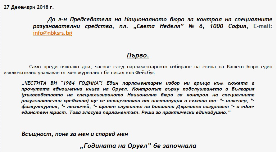 „ЧЕСТИТА ВИ „1984 ГОДИНА“! Един парламентарен избор ни връща към сюжета в прочутата едноименна книга на Оруел. Контролът върху подслушването в България (ръководството на специализираното Национално бюро за контрол на специалните разузнавателни средства) ще се осъществява от институция в състав от: *- инженер, *- физкултурник, *- лесничей, *- щатен служител на бившата Държавна сигурност *- и един-единствен юрист. Това гласува парламентът. Реши го практически единодушно.”