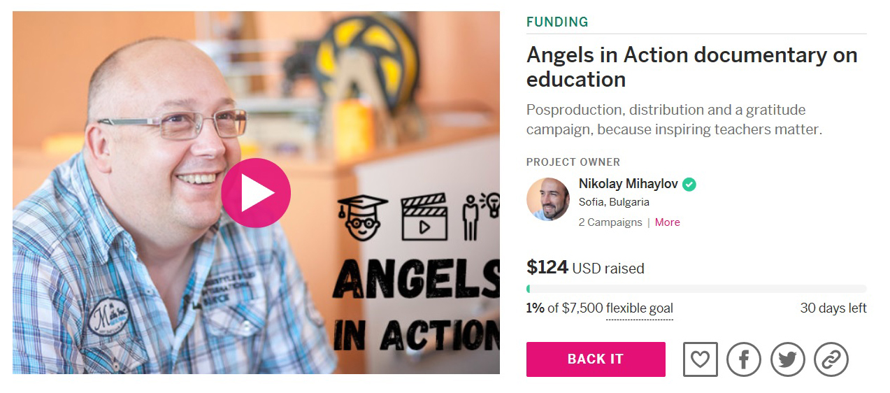 Пълнометражният документален филм „Ангели в действие“ е на етап постпродукция и от започва да набира средства, за да бъде завършен. Crowdfunding кампанията предвижда разходи и за поетапното му разпространение в България. Повече информация за филма и как да направите дарение можете да намерите на страницата на кампанията в Indiegogo на адрес: https://igg.me/at/angelsinaction.