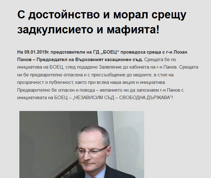 „На 09.01.2019 г. представители на ГД „БОЕЦ“ проведоха среща с г-н Лозан Панов – Председател на Върховният касационен съд. Срещата бе по инициатива на БОЕЦ, след подадено Заявление до кабинета на г-н Панов. Срещата ни бе предварително огласена и с прессъобщение до медиите, в стил на прозрачност и публичност, както при всяка наша акция и инициатива. Предварително бе огласен и поводът – желанието ни да запознаем г-н Панов с инициативата на „БОЕЦ“ – „НЕЗАВИСИМ СЪД – СВОБОДНА ДЪРЖАВА“!
