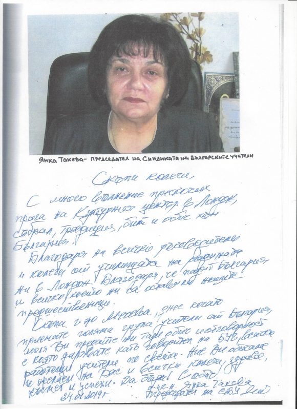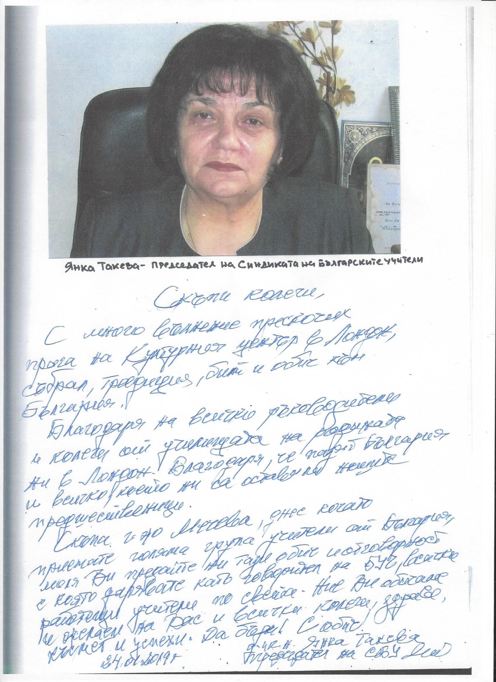 Накрая взех думата, за да представя колектива от БУ „Иван Станчов” към посолството. Винаги е удоволствие да изтъкна, че работя с висококвалифицирани и талантливи учители, всеки от които е незаменим. Невяна Анастасова – води малките ни азбукарчета на възраст от 4 до 6 години и всички просто са влюбени в добротата й. Г-жа Здравка Момчева – преподавател на 50 ученици от 9-ти до 12-ти клас, автор на две помагала за 9-ти клас в помощ на преподавателите по литература, магнит за големите ни тийнейджъри; д-р Валентина Александрова – преподавател по история и география, автор на две методики за преподаване по история в задграничните училища, а също и на много ценния труд, разказващ историята на всички български училища във Великобритания, с паралел между тях и училищата на другите общности във Великобритания като полската, румънската и унгарската. Изданието е на български и английски, и включва информация за цялостната дейност на АБУЧ.