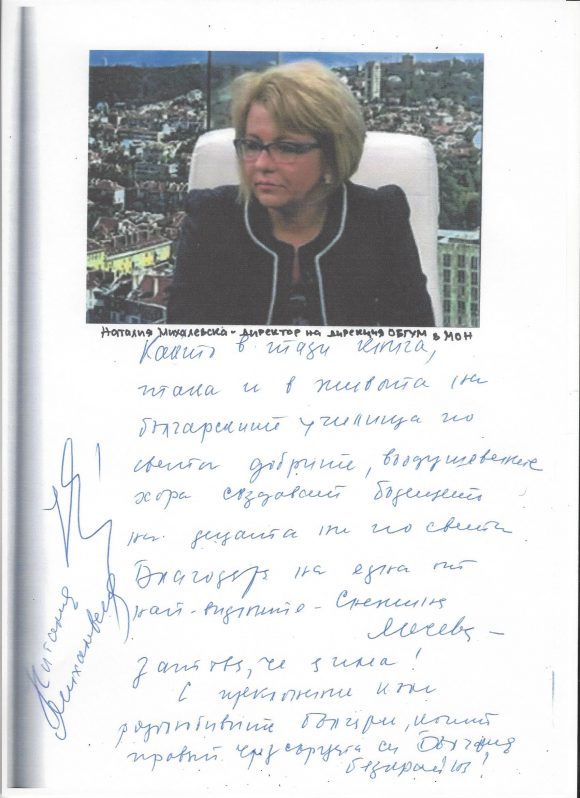 Делегацията на нашите гости бе водена от г-жа Наталия Михалевска – директор на дирекция „Образование на българите зад граница и училищна мрежа“ в МОН и г-жа Янка Такева – председател на Синдиката на българските учители. Много са годините, в които работим заедно с тях, много е преживяното и в трудно, и в добро. Професионалният контакт се е превърнал от необходимост в умение да си помагаме, да гледаме в една посока, да търсим решения на проблемите като съмишленици. Когато работиш с доверие – това си е и приятелство.