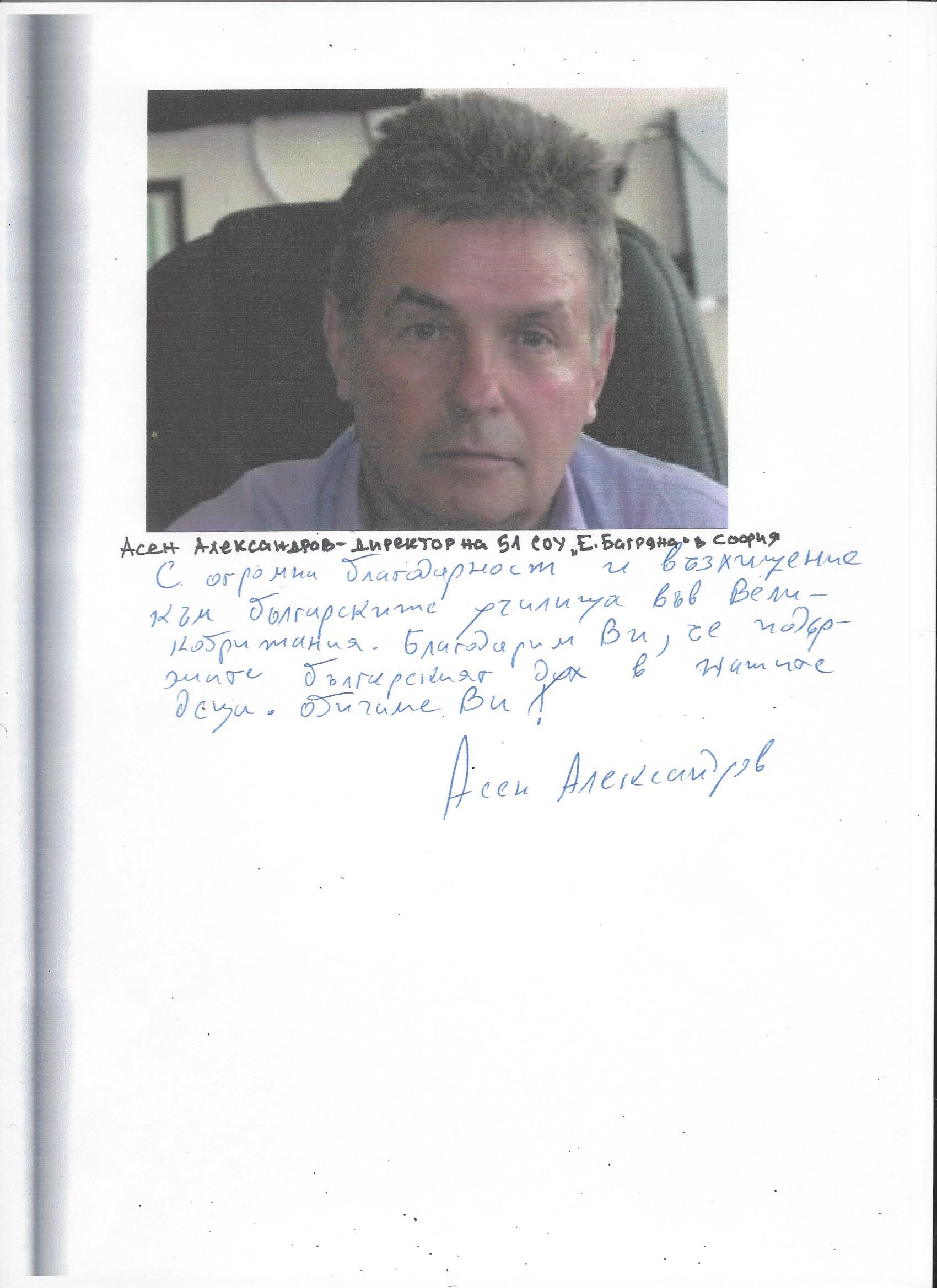 В личните разговори помежду ни намерихме толкова общо, толкова за споделяне. Оказа се, че с г-н Асен Александров сме учили в едно училище в София, после и двамата сме следвали в Пловдивския университет „Паисий Хилендарски”, сега и двамата сме директори на училища. А той живял в Чикаго две години, но в България го върнала носталгията. Както се случва с мнозина наши сънародници, случва се и с учениците ни.