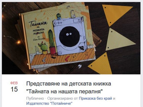Издателство „ПОТАЙНИЧЕ“ и Детска къща „ПРИКАЗКА БЕЗ КРАЙ“ организират представяне в София на „ТАЙНАТА НА НАШАТА ПЕРАЛНЯ“ на младата авторка ЕЛИНА КРЪСТЕВА, която живее в Лос Анжелос. Събитието ще бъде 15 февруари, от 16.00 ч. до 17.00 ч. местно време, в Детска къща „Приказка без край“ (ул. „Кръстьо Сарафов“ 41).