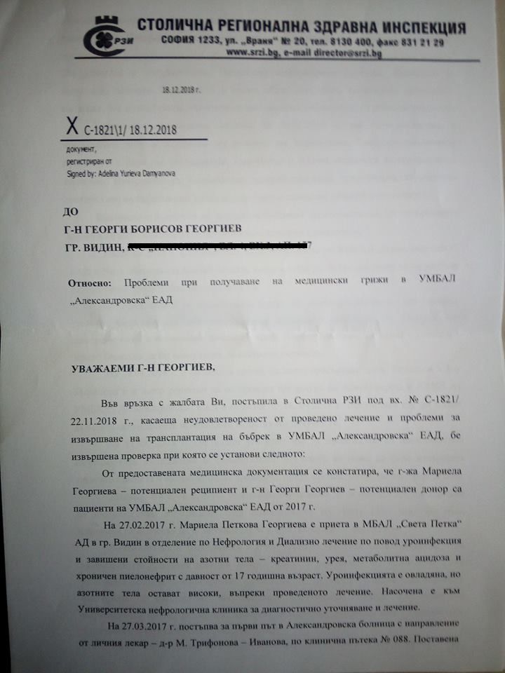 Столична регионална здравна инспекция отговори на сигнала ми за отказа на лечение на съпругата ми. Потвърждават всяка моя дума. Потвърждават, че никой не е имал никакви намерения да бъде извършена трансплантация на Мариела. Напротив, направено е всичко възможно трансплантация да не се случи. Мариела е диагностицирана и включена в листата на чакащи бъбречна трансплантация през март 2017 г. Веднага след това аз минах всички изследвания и бях одобрен за донор. И въпреки че ходихме многократно в София през следващите месеци и години за имунни тестове и изследвания, НИКОЙ не е направил крос-мач тест (тест за съвместимост), което е най-важното изследване. А бяхме лъгани през цялото време. Такъв тест е направен чак през септември 2018 г. – една година и половина по-късно, след като разритах свинчугите из министерството и разни агенции.