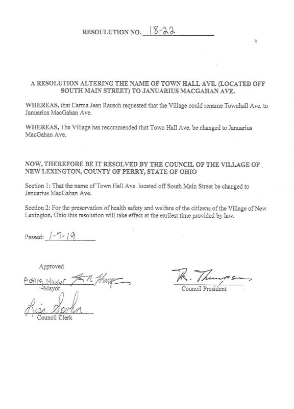 Генералното консулство на Р. България в Чикаго има удоволствието да уведоми, че на свое заседание на 17 декември 2018 г. Общинският съвет на гр. Ню Лексингтън, Охайо, е взел решение да ПРЕИМЕНУВА Town Hall Ave. в града на JANUARIUS MACGAHAN AVE.
