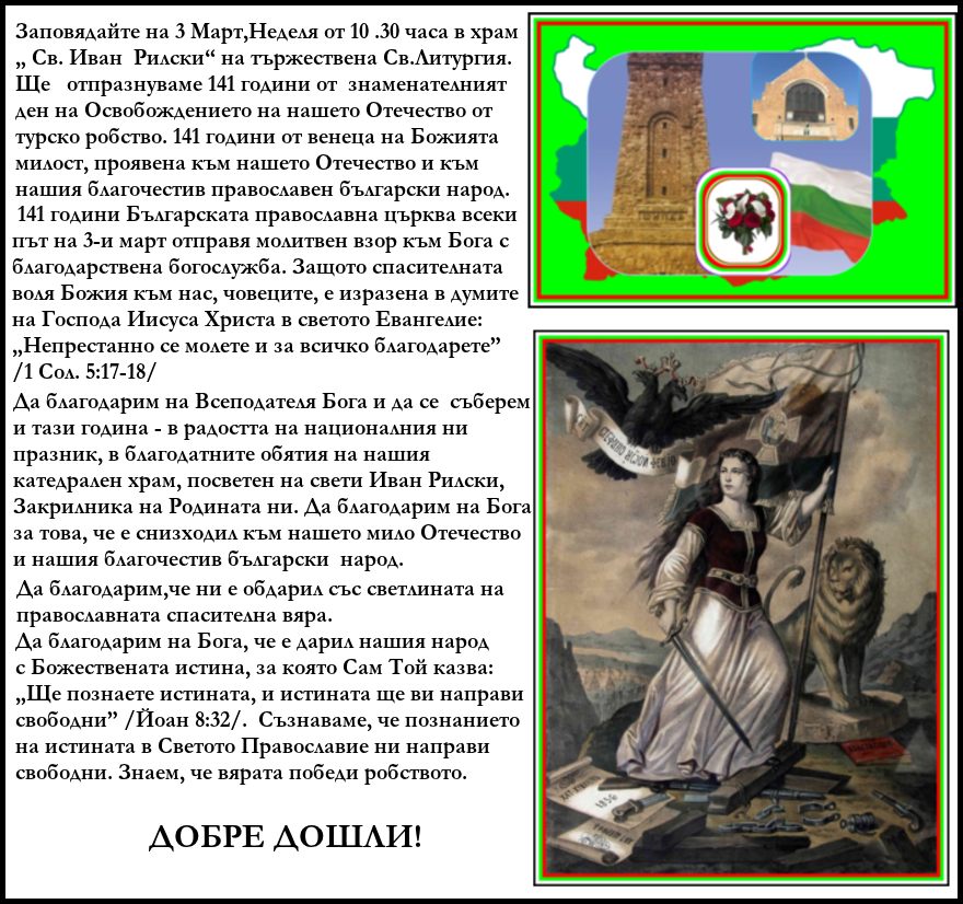 На 3 март, неделя, от 10.30 часа, в църквата „Св. Иван Рилски Чудотворец“ в Чикаго ще се отслужи тържествена Света литургия. В деня на Националния празник на България и по случай 141 години от Освобождението на страната, всички желаещи сънародници могат да дойдат и да се помолят в храма за Божията милост и подкрепа за България и българския народ.