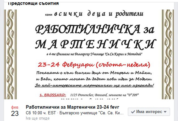 Българско училище „Св. св. Кирил и Методий“ в Монреал (6767 Cote des Neiges, # 693.3, Montreal, Quebec H3S 2T6) организира на 23 и 24 февруари т.г. (събота и неделя), от 10 до 17 часа местно време, работилница за мартенички. Такава работилница ще има в четирите филиала на училището.