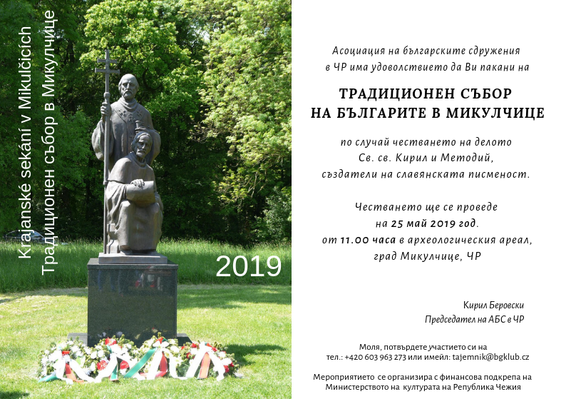 Асоциацията на българските сдружения в Чешката република организира за пореден път традиционния Събор на българите в Микулчице. Събитието, подкрепено финансово от чешкото Министерство на културата, ще се състои на 25 май 2019 г., в чест на Светите братя Кирил и Методий и на най-красивия празник на буквите.