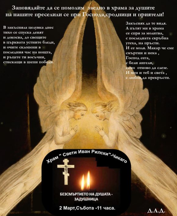 На 2 март, събота, от 11 часа, в храма „Св. Иван Рилски Чудотворец“ в Чикаго ще има църковна служба. Всички желаещи православни християни могат да дойдат в храма на Задушница и да се помолят заедно за душите на починалите си сродници, близки и приятели.