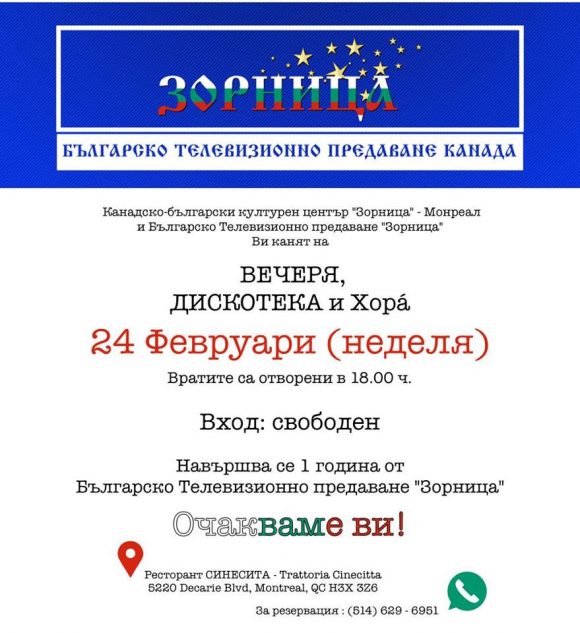 Навършва се една година от началото на БЪЛГАРСКОТО ТВ ПРЕДАВАНЕ „ЗОРНИЦА“. Канадско-български културен център „Зорница“ – Монреал и ТВ предаване „Зорница“ организират по този повод коктейл с вечеря, дискотека и хорá. Тържеството ще бъде на 24 февруари, неделя, от 18 часа, в ресторант „СИНЕСИТА“ (Trattoria Cinecitta) в Монреал. Входът е свободен.