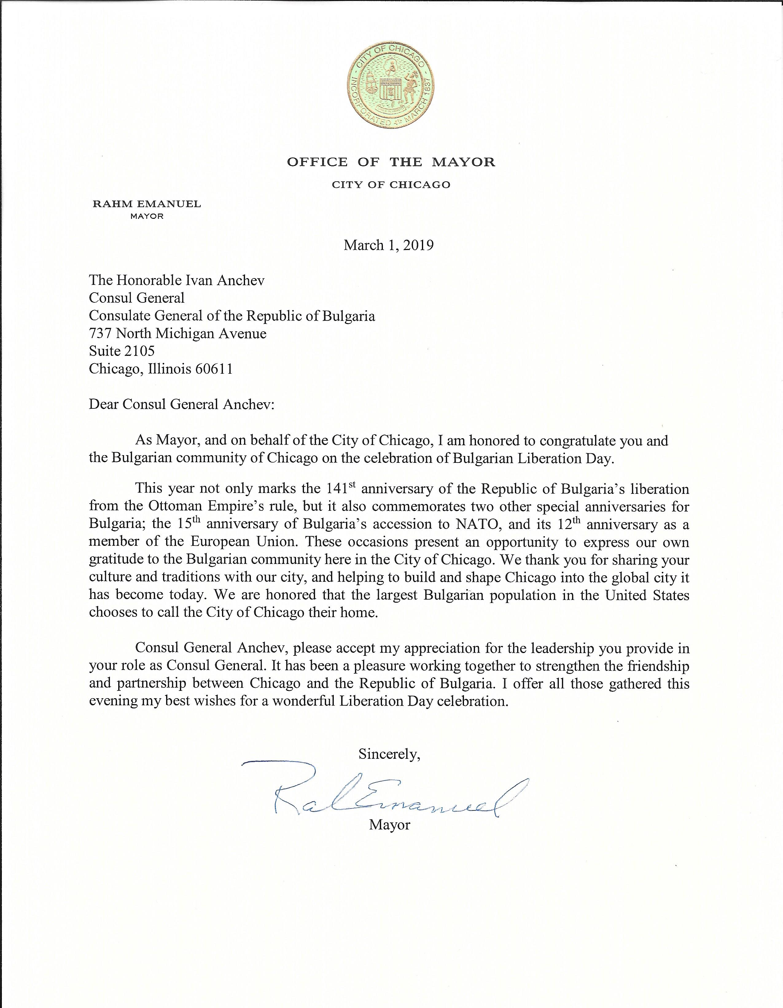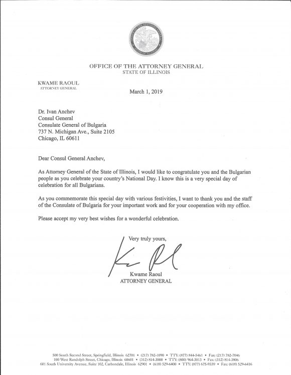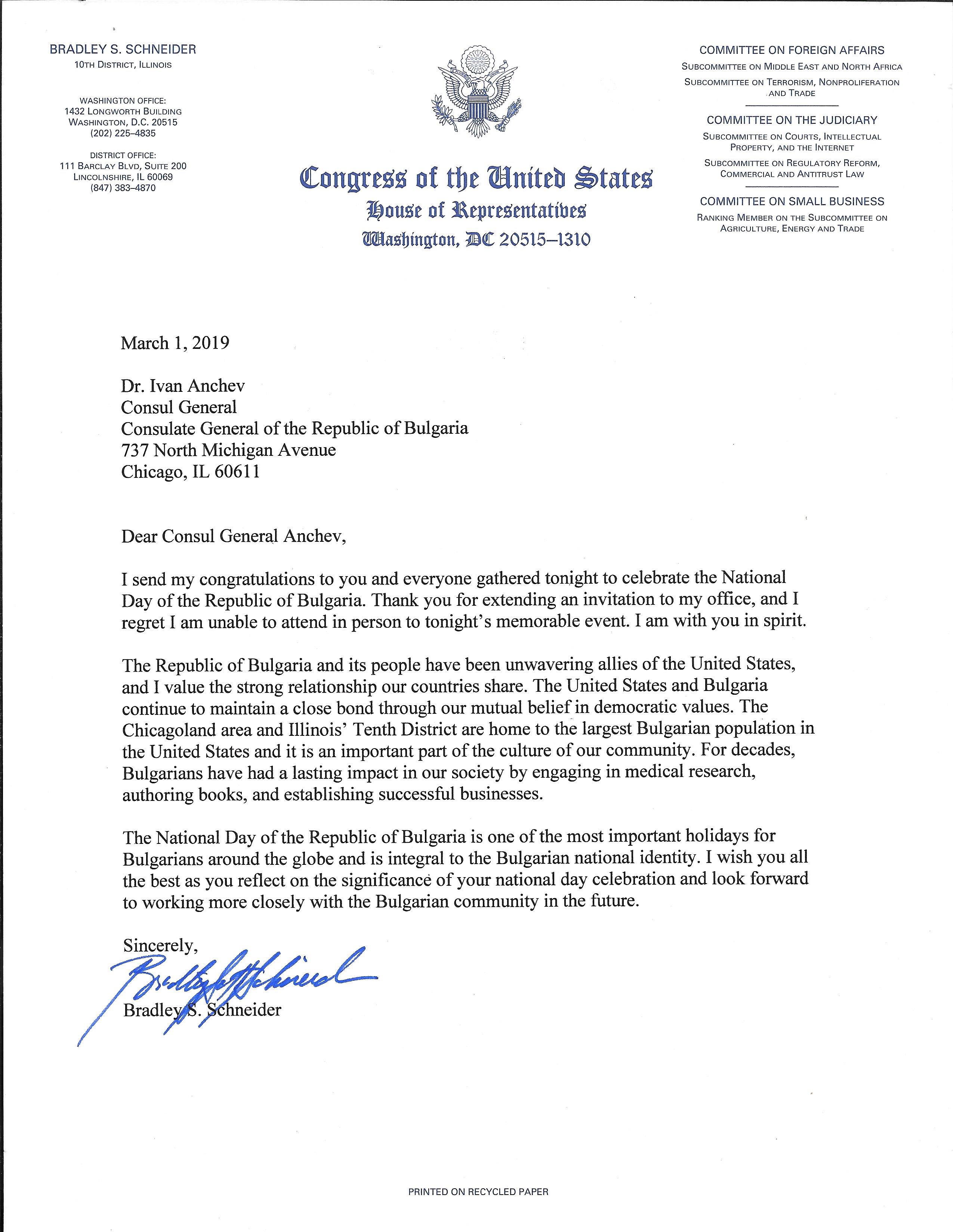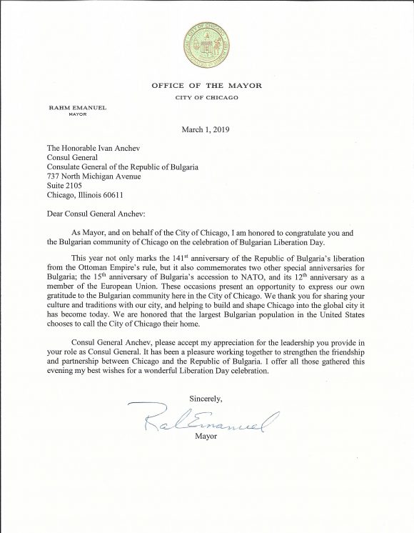 По повод Националния празник 3-ти март, до Генералното консулство на Р. България в Чикаго и генералния консул, г-н Иван Анчев, бяха изпратени поздравителните адреси от кмета на Чикаго, г-н Рам Емануел, от конгресмен Брадли „Брад“ Шнайдер и от главния прокурор на щата Илинойс Куаме Раул. Факсимилета от тези адреси, чието съдържание може да се види по-долу, бяха предоставени от Генералното консулство на местните български медии.