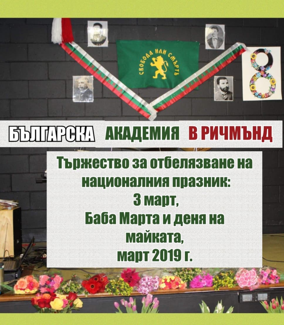 На 2 март 2019 г. младото българско училище “БЪЛГАРСКА АКАДЕМИЯ В РИЧМЪНД” отново събра голяма част от българската общност в Ричмънд, Вирджиния, за отбелязване на поредните български празници и традиции, но, за разлика от Коледното празненство, сега предмет на тържеството бяха не един, а три български празника: НАЦИОНАЛНИЯТ ПРАЗНИК 3-ти МАРТ, БАБА МАРТА И ДЕНЯТ НА МАЙКАТА 8-ми МАРТ!