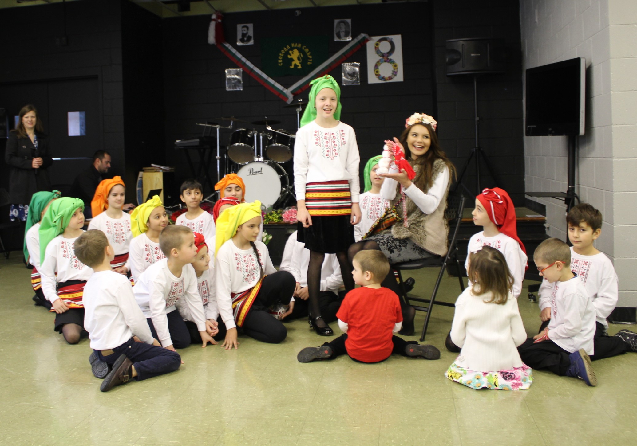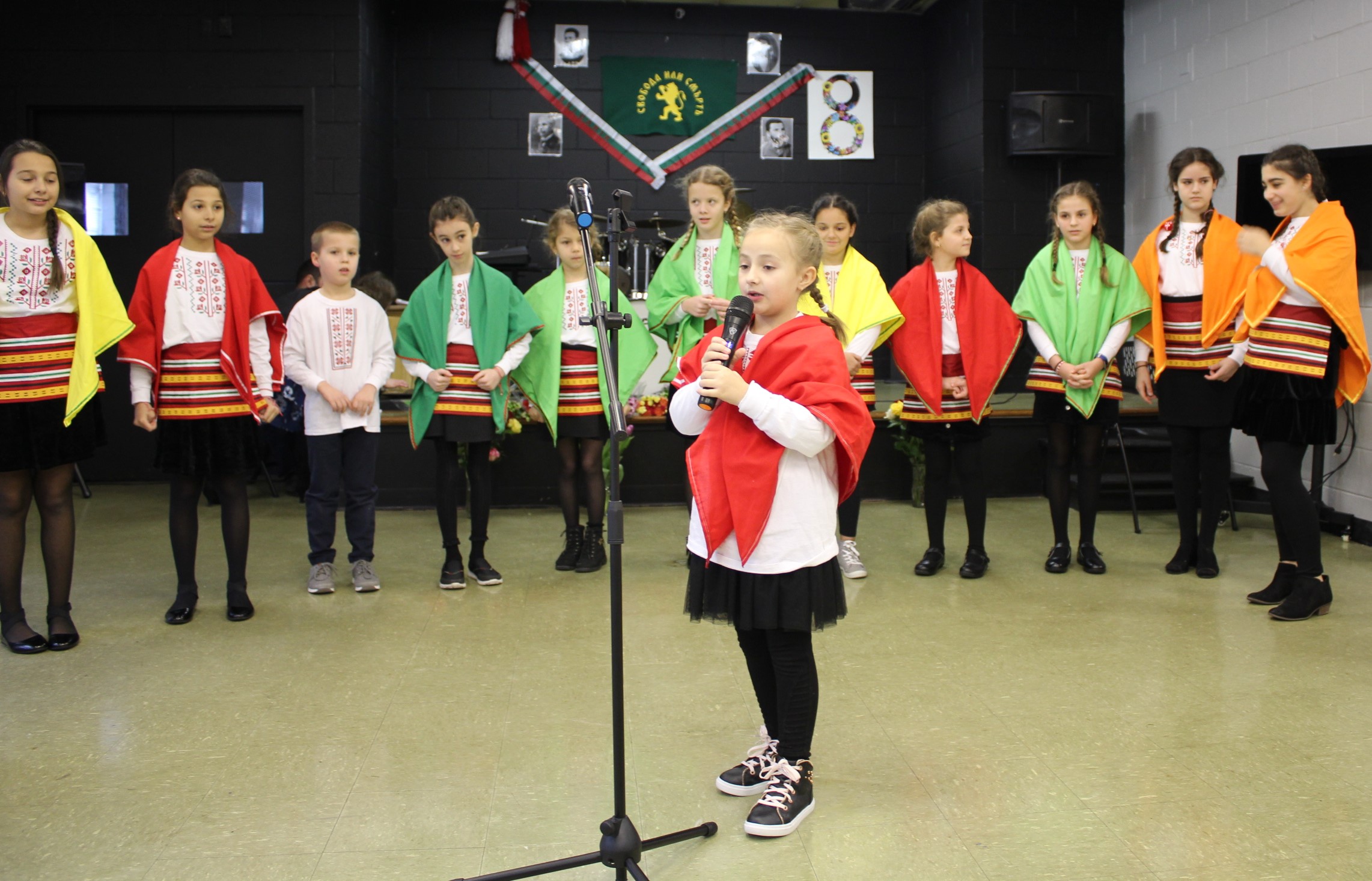 Докато последното дете рецитираше завършващите строфи за мартеничките, другите деца се изтеглиха тихо извън сцената и зазвуча възрожденска песен. На сцената децата се завърнаха, облечени в черни дрехи, а хореографът Костадинова беше махнала цветята от косите си и беше заменила бялата блуза и престилка с народни мотиви, с черна блуза и тъмна пола, въплъщаваща ПОРОБЕНАТА МАЙКА БЪЛГАРИЯ!