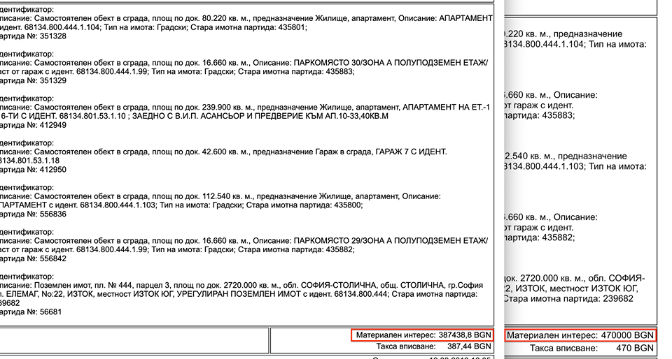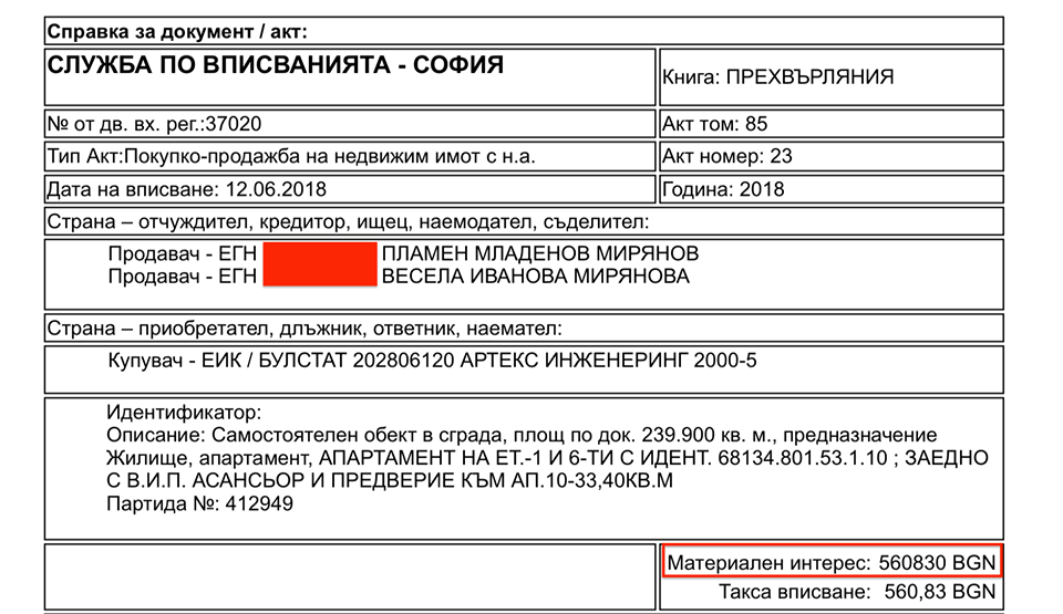 „Ето една сделка на „Артекс“ за апартамент от 117 кв.м. + гараж 20 кв. м., продадени за 598 000 лв. или около 2200 евро/кв.м. При това без частен ВИП асансьор. Сравнете с апартамента на Цв. Цв. – 239 кв.м. + гараж 42 кв.м. за 387 438 лв. или около 700 евро/кв. м.“