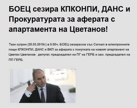 Днес Гражданско движение „БОЕЦ“ е сезирало със Сигнал в електронните пощи КПКОНПИ, ДАНС и ВКП, „за аферата с покупката на новия апартамент на Цветан Цветанов – депутат, председател на ПГ на ГЕРБ и зам.-председател на ПП ГЕРБ“.