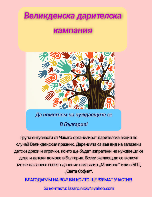 Група българи в Чикаго организират Великденска дарителска кампания, в помощ на нуждаещи се деца и детски домове в България. В кампанията се събират запазени детски дрехи и играчки, които ще бъдат изпратени на нуждаещи се деца в Родината.