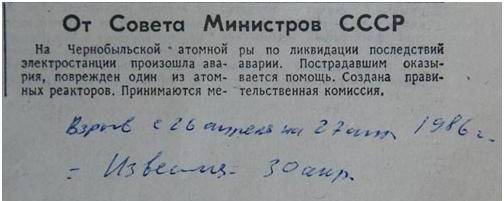„В Чернобилската АЕЦ е станала авария. Един от реакторите е повреден. Последиците от инцидента се отстраняват. Предоставя се помощ на засегнатите хора. Съставена е разследваща комисия.“