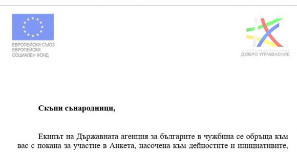 Екипът на Държавната агенция за българите в чужбина се обръща към Вас с покана за участие в Анкета, насочена към дейностите и инициативите, които развивате, с цел актуализиране на бази данни и информацията за организациите на българи, живеещи извън Република България.