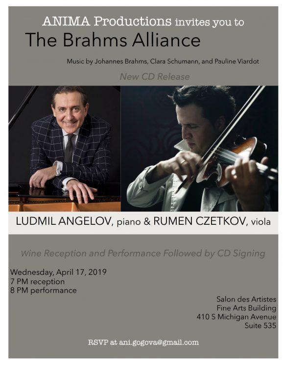 Представяне в ЧИКАГО на новия диск на нашия именит пианист ЛЮДМИЛ АНГЕЛОВ и неговия колега, виолиста РУМЕН ЦВЕТКОВ. Гостуват тук само в сряда, между участия в Монреал и Ню Йорк.