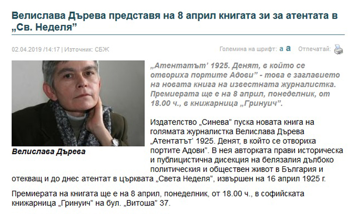 Издателство „Синева” пуска новата книга на журналистката Велислава Дърева „Атентатът’ 1925. Денят, в който се отвориха портите Адови”. В нея авторката прави историческа и публицистична дисекция на белязалия дълбоко политическия и обществен живот в България, и отекващ и до днес атентат в църквата „Света Неделя”, извършен на 16 април 1925 г.