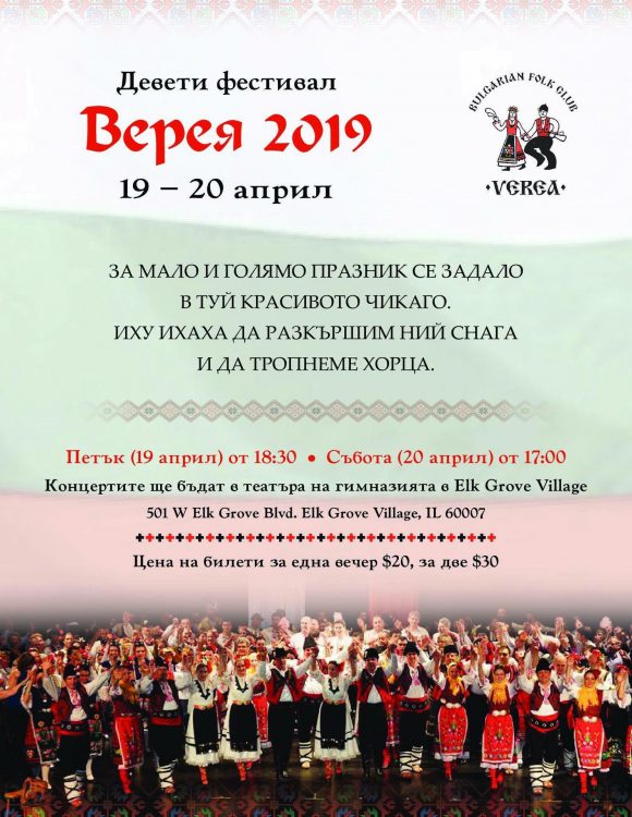Деветият фолклорен фестивал „ВЕРЕЯ ‘2019“ в Чикаго ще се състои на 19 и 20 април т.г. В петък, 19 април, фестивалът ще започне от 18.30 часа, а в събота, 20 април, от 17 часа. Концертите ще бъдат в театъра на гимназията Elk Grove Village. Цена на билетите за една вечер – $20, за две – $30.
