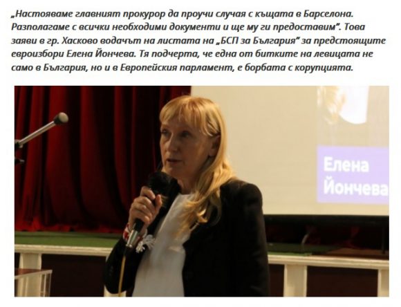 „Настояваме главният прокурор да проучи случая с къщата в Барселона. Разполагаме с всички необходими документи и ще му ги предоставим”. Това заяви в гр. Хасково водачът на листата на „БСП за България” за предстоящите евроизбори Елена Йончева. Тя подчерта, че една от битките на левицата не само в България, но и в Европейския парламент, е борбата с корупцията.
