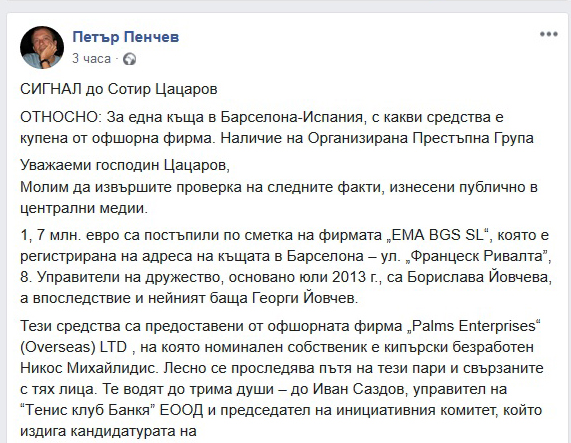 По същия въпрос, за т.нар. къща в Барселона, главният Сотир Цацаров вече е бил сезиран от Петър Пенчев, член на Обществения съвет на Асоциацията на свободното слово „Анна Полинковская“. До главния прокурор е изпратен следният сигнал: