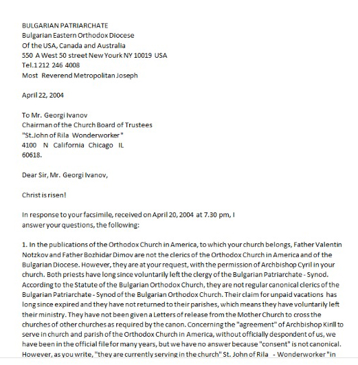Ето писмото на митрополит Кирил Йончев, който беше български Владика. Нека Ви напомня също, че до неговата смърт, нашата, така наречена от Вас „църква перлен бисер“ не е имала никакъв проблем. Проблемите започват вследствие на продължаващата и до ден днешен анархия в ОСА:
